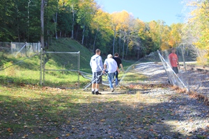 walking over a trodden-down, vandalized gate, stepping on and over a