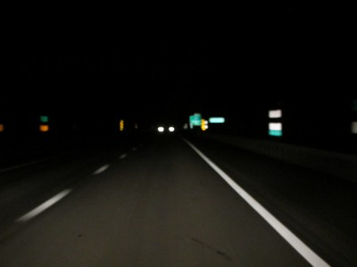 down a busy highway at night. The traffic is dense and you feel quite