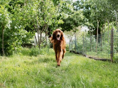 My Irish Setter Ruby, tore a large gash in her chest, when she encountered a strand of barb wire, as she was galivanting through the bush.  Fortunately, the tear did not penetrate the muscle.  I doctored the wound and it was healing well, until Ruby figured out how to twist and lick it. Other measures then needed to be taken, so my daughter produced one of the girls, outgrown T-shirts which fit Ruby perfectly.  The T-shirt not only protected the wound from further damage from dirt and debris, but also from Ruby's licking which was preventing it from drying and healing.