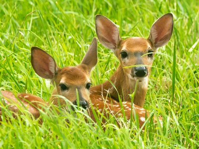 I looked outside the window one Saturday morning and saw a spotted fawn tucked into the grass, sitting still, as if in deep thought. Its mother camouflaged the young one to keep it safe from predators, while she went off to forage. The young deer at this point has not developed strong legs to run if attacked, hence staying put where it was placed was its safety. The mother might leave the fawn alone for hours at a time and may even take a day or two before she moves it to a different location.